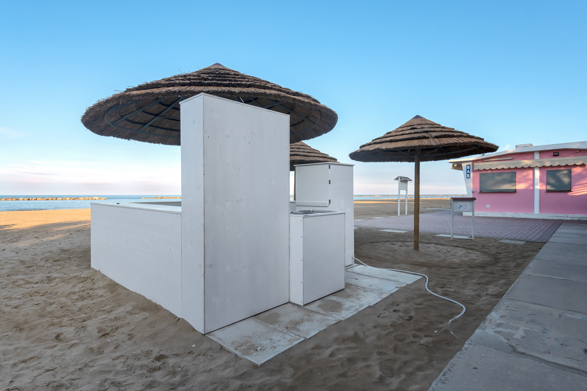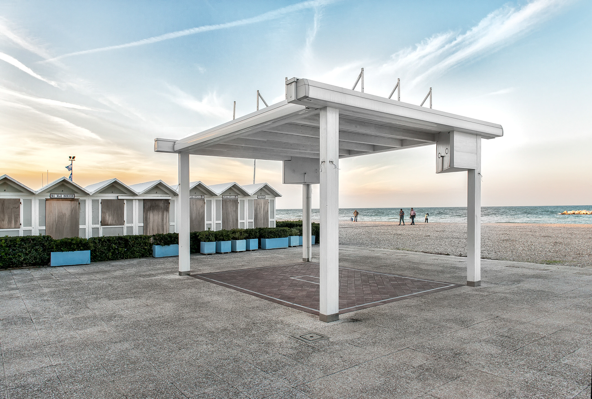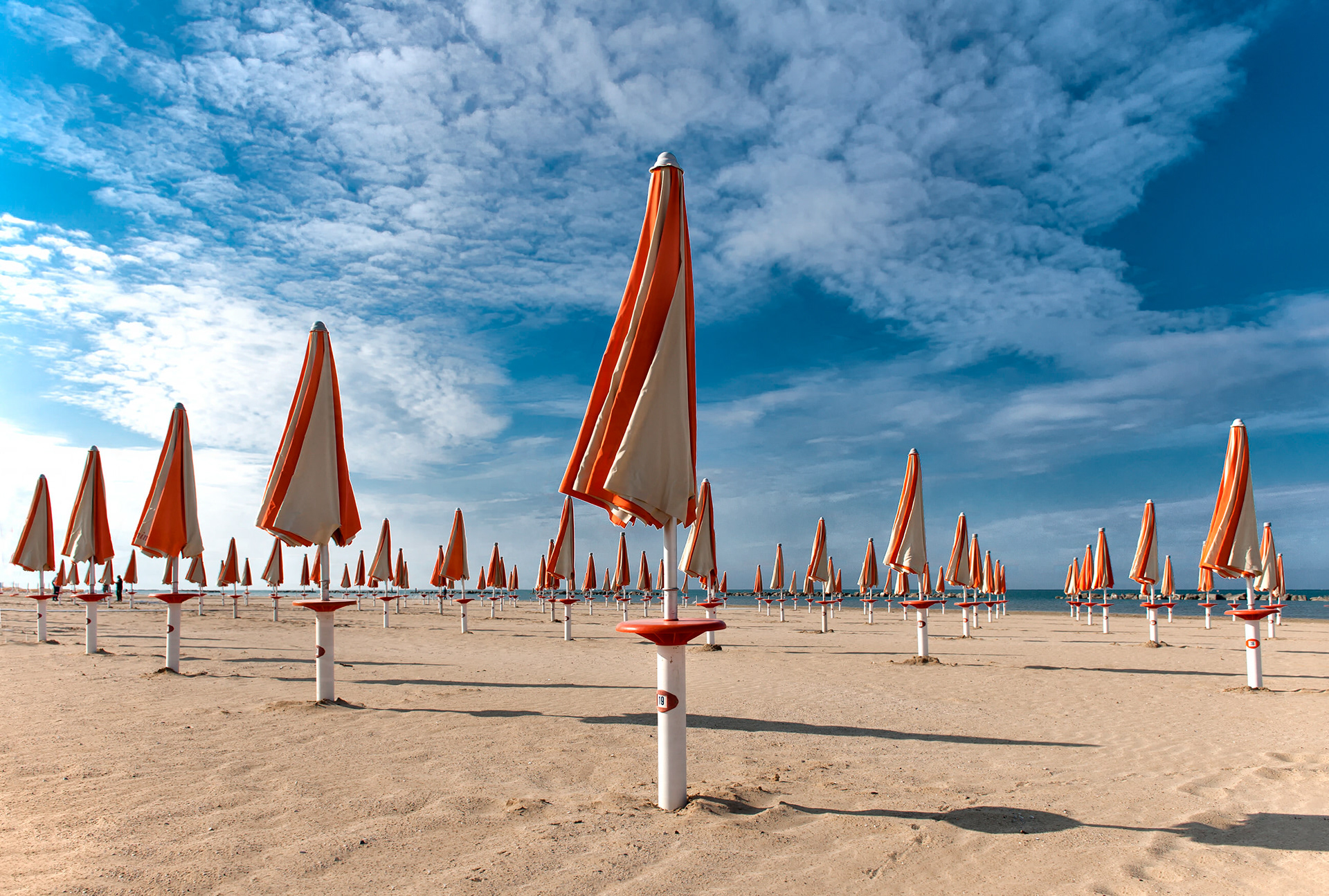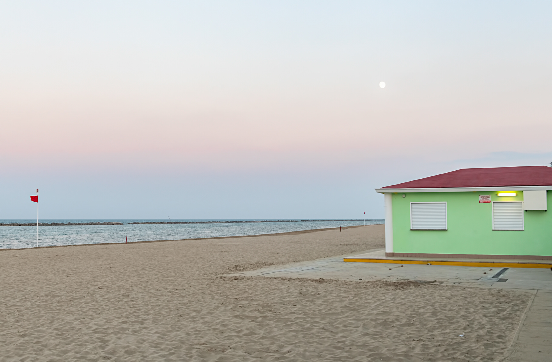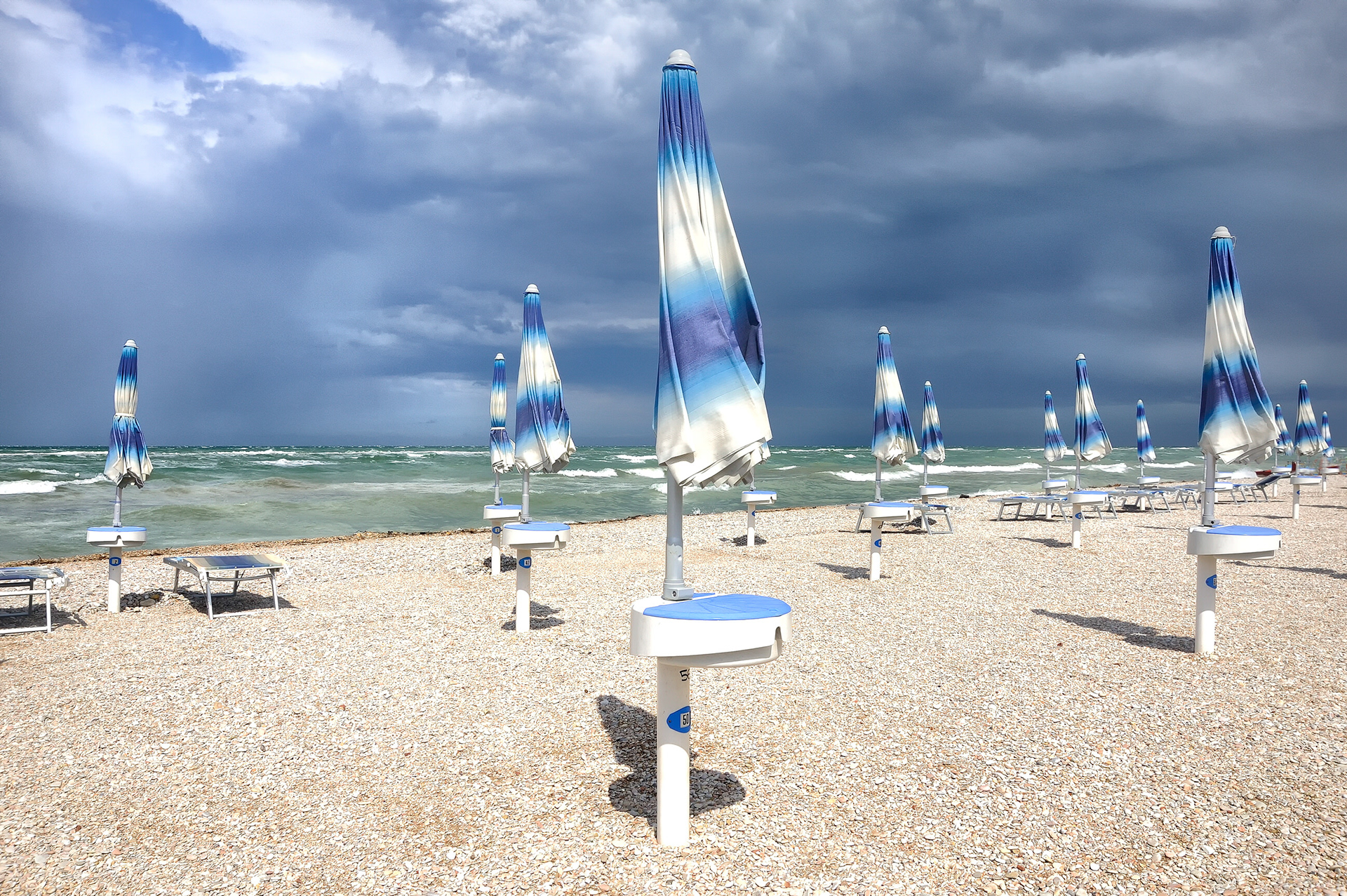 Im September endet die Saison an der italienischen Adria. Die Touristen sind wieder weg. Die Badehütten, die leeren Hotels und die verwaisten Ständer für die Sonnenschirme bleiben. Sie wirken jetzt wie Kulissen für das Theaterstück mit den Touristen, das jedes Jahr im Sommer von Neuem aufgeführt wird. Eigentlich sind auch Strand und Meer nur Rahmen für diese Aufführung.